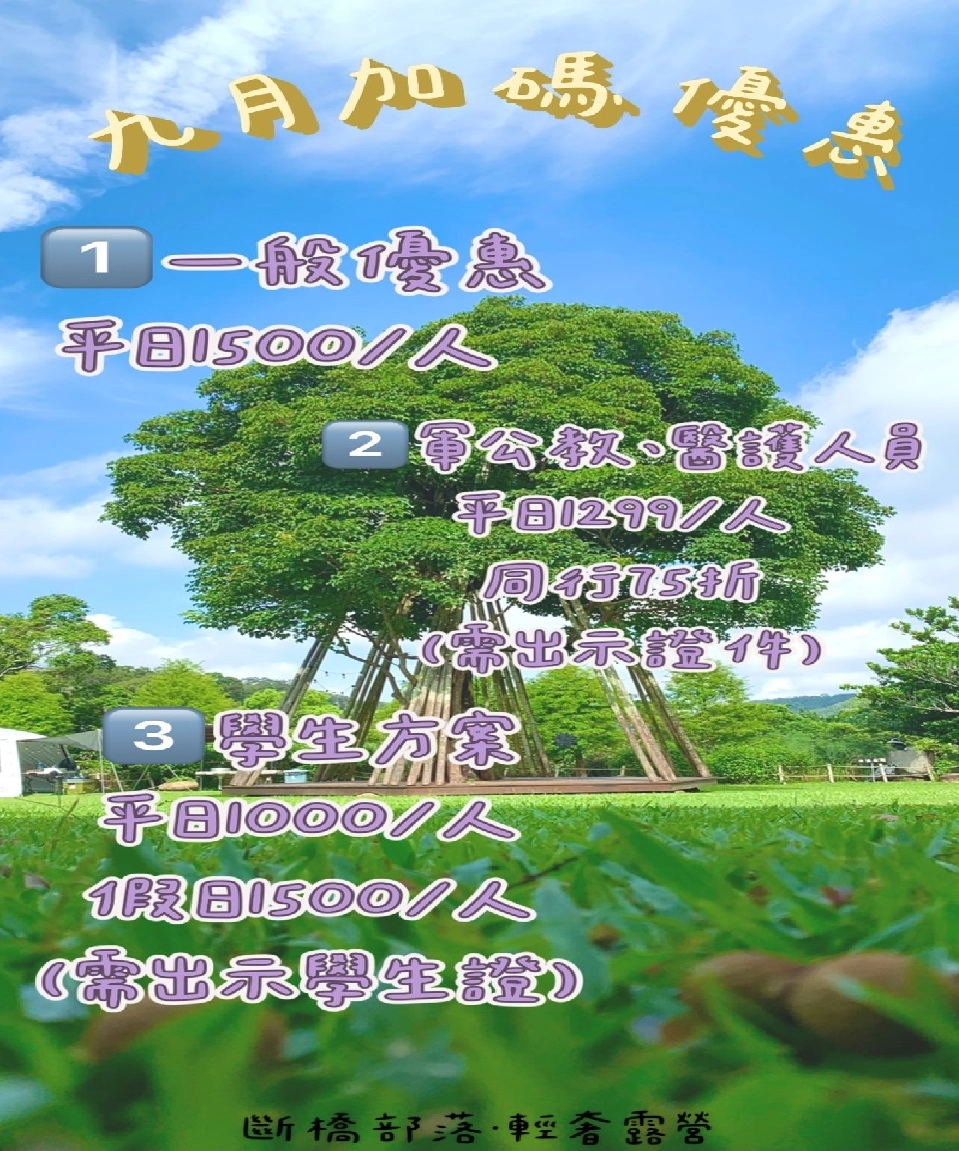 🔅 優惠加碼 九月繼續 🔅 🔅最新優惠🔅 暑假做好安排了嗎 使用官方LINE預約 都有專屬優惠✨✨ 🪧預約9-10月 1️⃣平日1500/人(不限職業) 2️⃣ 軍公教 & 醫護專屬優惠 出示證件享1299/人 同行人及家屬再享 75折優惠 3️⃣ 學生優惠 平日1000/人 假日 1500/人 (出示學生證) 🌸一泊二食·客廳帳·炊事組 🌼備品選用 茶籽堂 天然環保品牌 🚂鐵道自行車特約商家 🔍官方LINE:@828rzqou 透過露營,找回生活的樂趣 一起來玩吧 官方LINE預約:@828rzqou